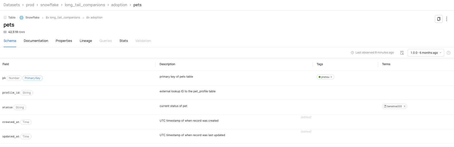 You can view the Schema History for a Dataset by navigating to that Dataset's Schema Tab. As long as that Dataset has more than one version, you can view what a Dataset looked like at any given version by using the version selector. Here's an example from DataHub's official Demo environment with the Snowflake pets dataset.
